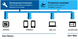 - Dart支持两种构建方式:编译成Native代码 & 转译成JavaScript代码,使Flutter能适配Native APP和Web APP