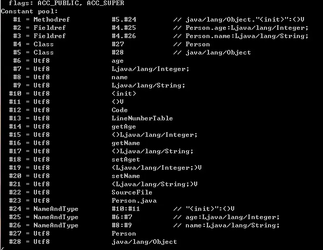 这个容量计数是从1开始的。如下图所示:常量池容量(偏移地址: 0x00000008) 为十六进制数0x0013,则十进制为19,则这里有18个长常量,索引范围为1-18,在Class文件格式规范制定之时, 设计者将第0项常量空出来是有特殊考虑的, 这样做的目的在于, 如果后面某些指向常量池的索引值的数据在特定情况下需要表达“不引用任何一个常量池项目”的含义, 可以把索引值设置为0来表示。 javap -verbose反解析 生成汇编指令,下面图片可以看到Person常量池数量28个