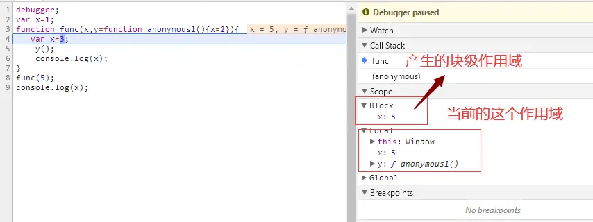 2、在此作用域中出现了let、var、const...(出现过私有变量的这种行为)就会产生两个作用域,相当于多形成了一个私有的块级作用域,而且会把开始的私有的形参赋值也给块级一份