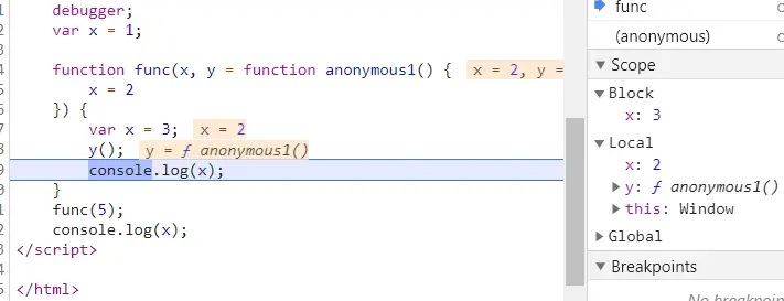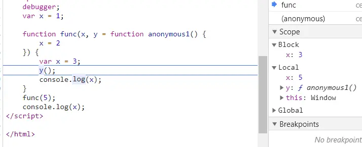 function func(x,y=function anonymous1(){x=2}){
