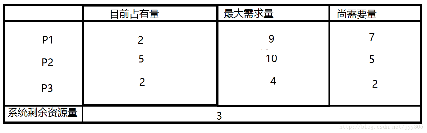 如上图所示系统处于安全状态,系统剩余3个资源,可以把其中的2个分配给P3,此时P3已经获得了所有的资源,执行完毕后还能还给系统4个资源,此时系统剩余5个资源所以满足(P2所需的资源不超过系统当前剩余量与P3当前占有资源量之和),同理P1也可以在P2执行完毕后获得自己需要的资源。