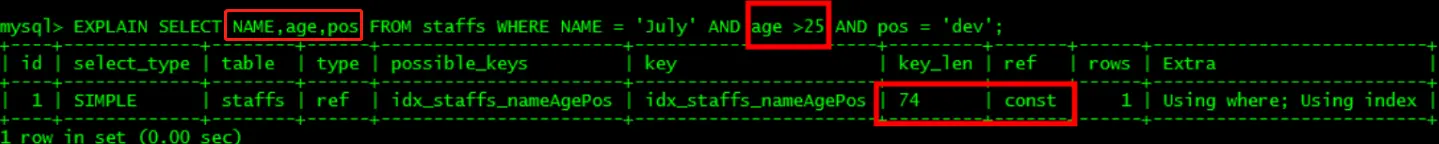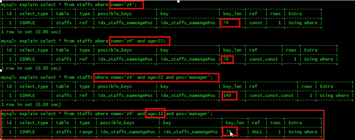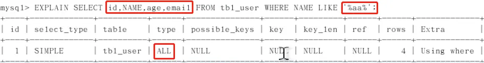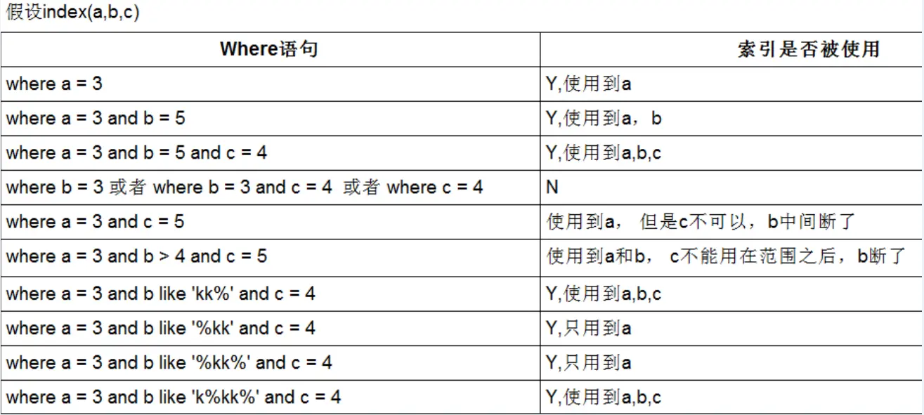 - 最佳左前缀法则:查询从索引的最左前列开始并且不跳过索引中的列,中间跳过的值,后面的索引会失效