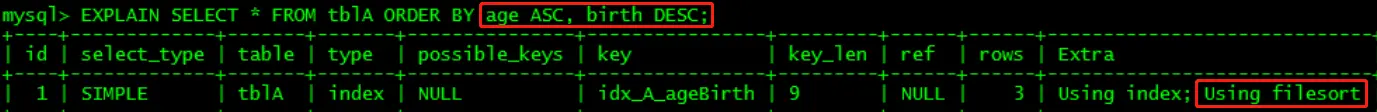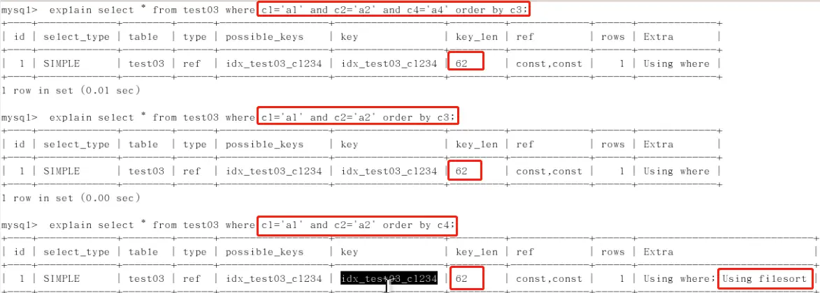 3、都只用到了c1,c2,第三条语句无法使用到索引排序,所以mysql内部自己进行了一次排序(前两个c3没用到查找,但用到了排序,所以无using filesort,只是没有记录到key_len里)