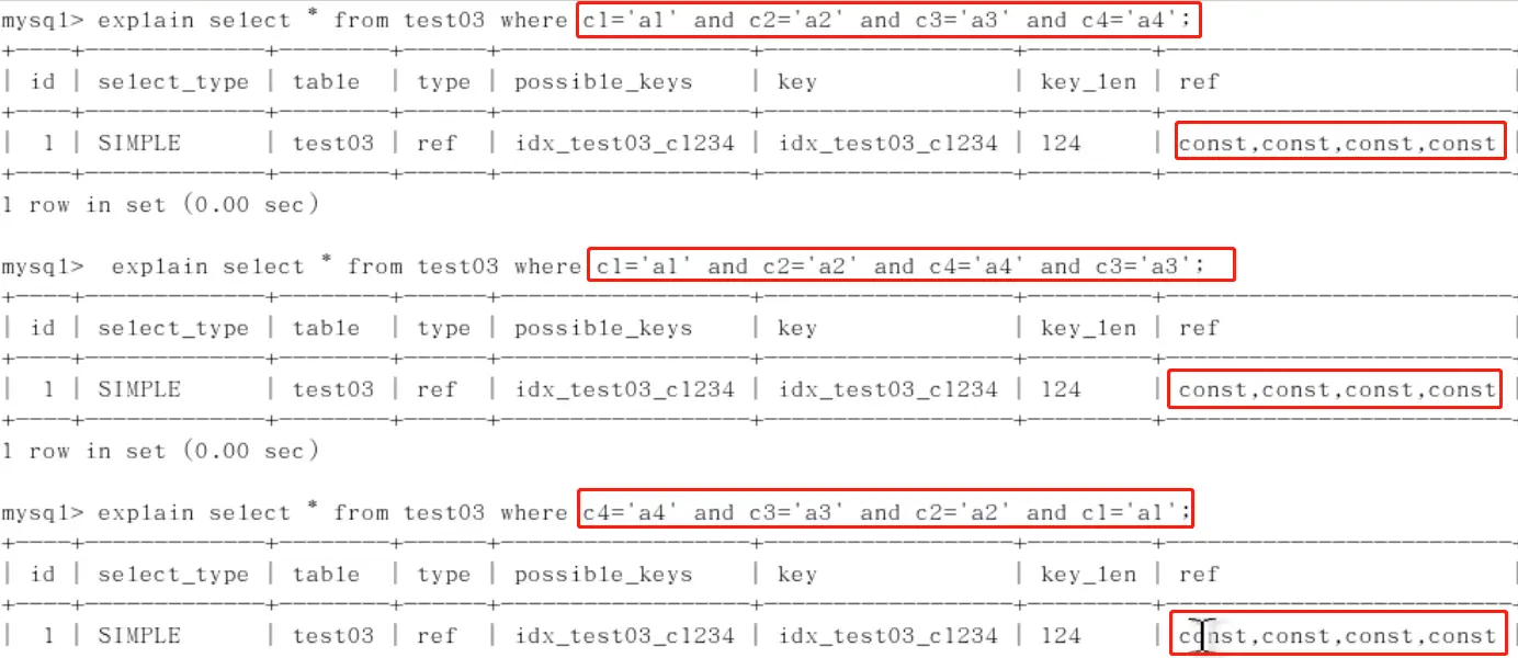 1、对于常量类型,查询优化器会自动调优SQL,顺序不影响