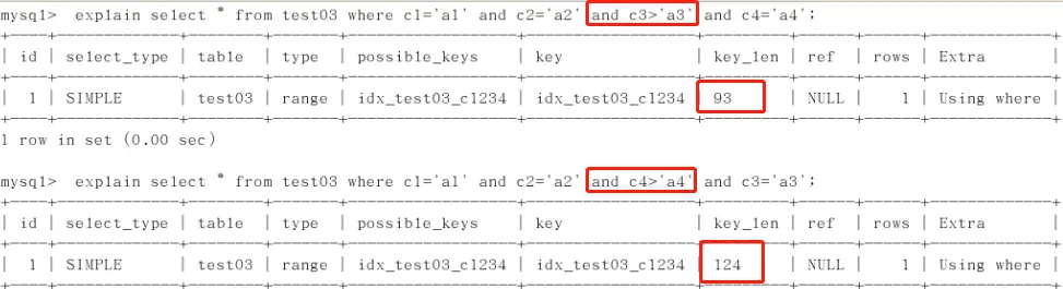 2、范围之后全失效,但查询优化器会先常量类型自动调优,c3被调前,c4后的失效,但c4是最后一个了,所以仍用到4个