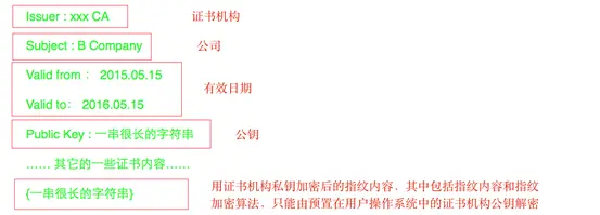 B company得到这张证书后,会在与用户通信的过程中将证书发送给用户,用户首先会检测办法证书的机构,如果是大家都公认的证书机构,操作系统在出厂时会内置这个机构的机构信息和公钥,例如xxx CA,如果是一个不受信任的证书机构,应用程序(比如浏览器)会发出警告,如果是受信任的证书机构,应用程序会使用预置的xxx CA的公钥去解密最后的指纹内容和指纹算法,然后再把前面的证书内容用指纹算法计算后与指纹内容比对,由于指纹内容是由证书机构唯一的私钥加密的,因此只要比对成功说明证书是没有人被人修改过的。接下来用户就可以放心使用该公司的公钥了。