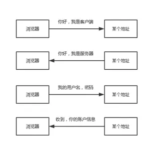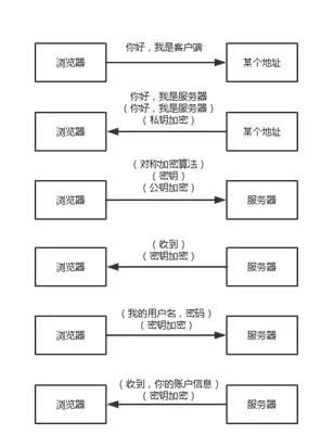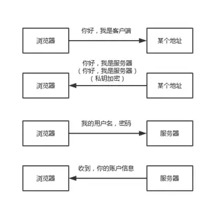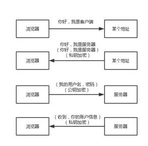这个通信过程槽点太多,这样一个网络通信过程属于小学生水准,首先最明显一个错误是作为客户端如何知道给予回应一定是目标服务器,黑客可以有一百种办法来伪装这个服务器,轻轻松松就拿到用户的用户名和密码,所以图中也只能无奈的使用“某个地址”来标识服务器。为了解决这个问题,首先需要让浏览器确认对方的身份,于是有了下面的通信过程。