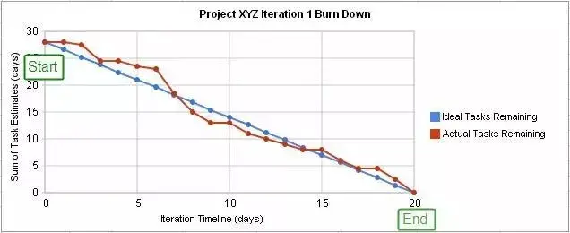 在项目完成之前,对需要完成的工作的一种可视化表示。燃尽图有一个Y轴(工作)和X轴(时间)。该图表是一个向下的曲线,随着剩余工作的完成,“烧尽”至零。互联网开发项目中通常情况下使用白板来制作,一边是项目进度、一边是人员分工的贴纸,每天上班或下班前会对人员分工贴纸或问题做一个记录和解决;