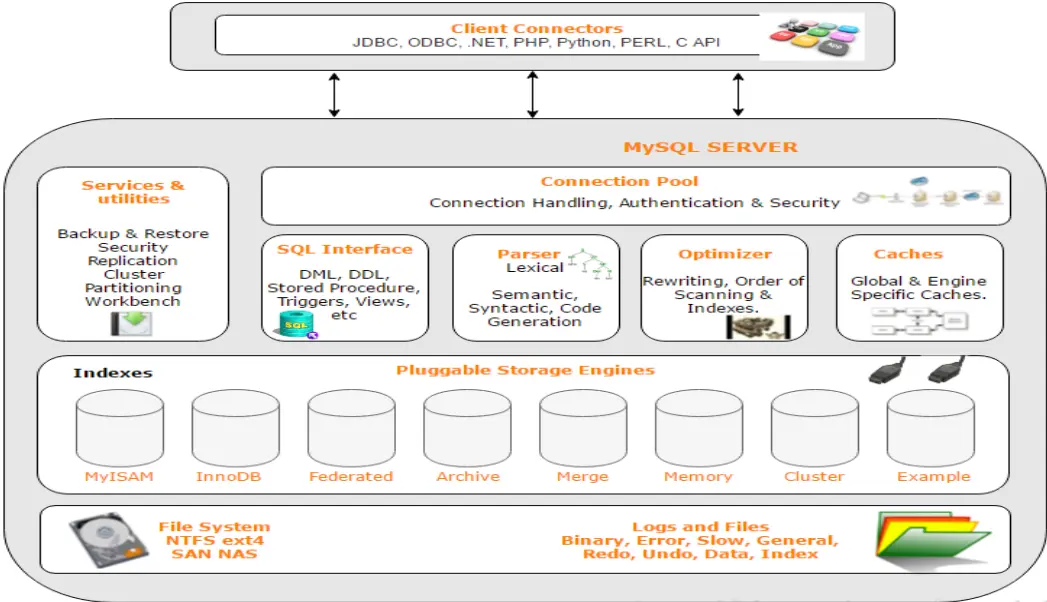 连接层:最上层是一些客户端和连接服务。主要完成一些类似于连接处理、授权认证、及相关的安全方案。在该层上引入了线程池的概念,为通过认证安全接入的客户端提供线程。同样在该层上可以实现基于SSL的安全链接。服务器也会为安全接入的每个客户端验证它所具有的操作权限。
