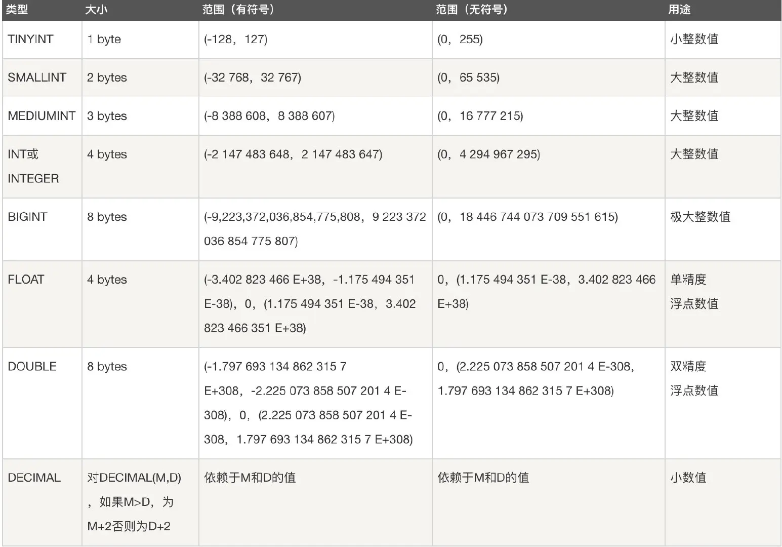- 浮点数类型:FLOAT、DOUBLE、DECIMAL
