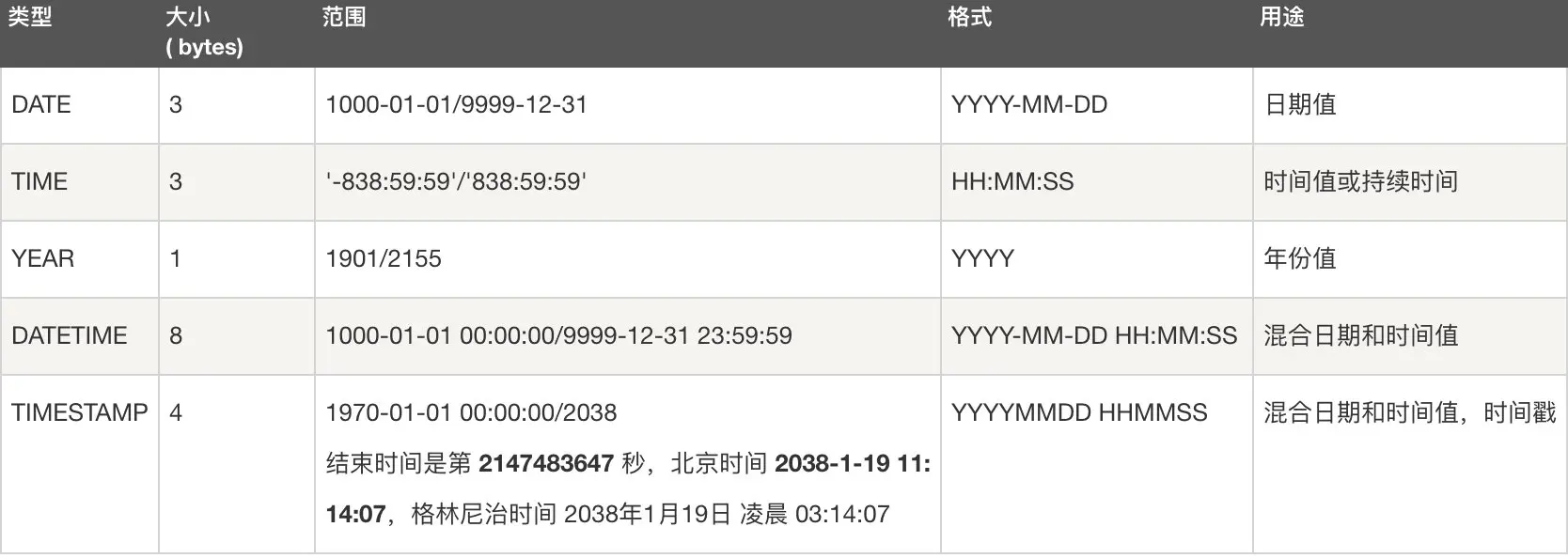 - 日期类型:Date、DateTime、TimeStamp、Time、Year