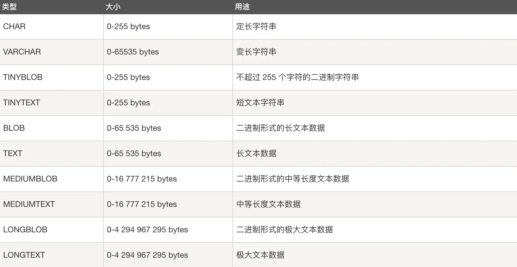 - 字符串类型:CHAR、VARCHAR、TINY TEXT、TEXT、MEDIUM TEXT、LONGTEXT、TINY BLOB、BLOB、MEDIUM BLOB、LONG BLOB