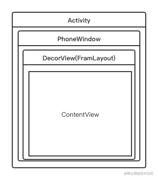 **注意:**其实这里只是Activity、PhoneWindow、decorView、contentView 4者之间关联起来,我们的View也就是decorView并没有真正的加入到Window中来。如下图