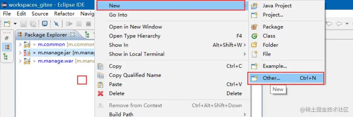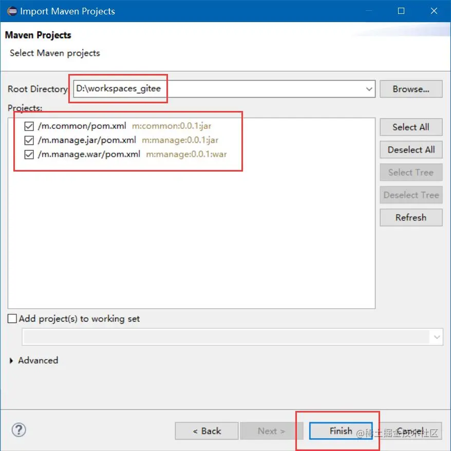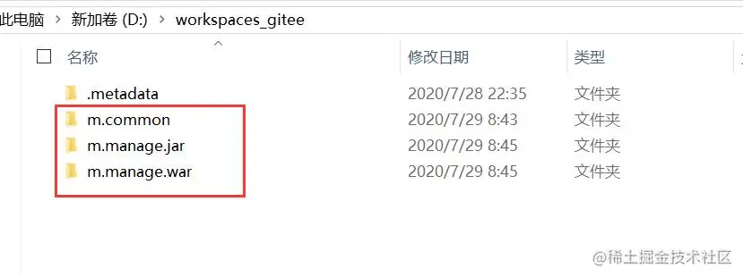 我使用的是eclipse,所以我先创建了wookspaces_gitee的工作空间,然后把三个项目都下载到该目录下,如图