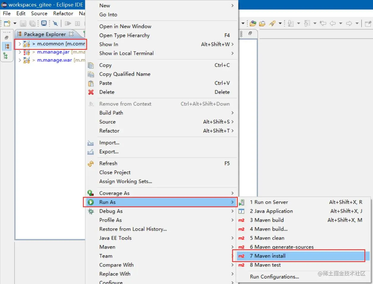 先将项目导入eclipse里并Maven install,操作如下图