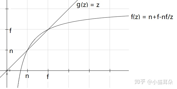 透视变为正交时,f(z) = z′/w′ = n+f-nf/z,当0<n<z<f时,n+f-nf/z跟z的大小关系: