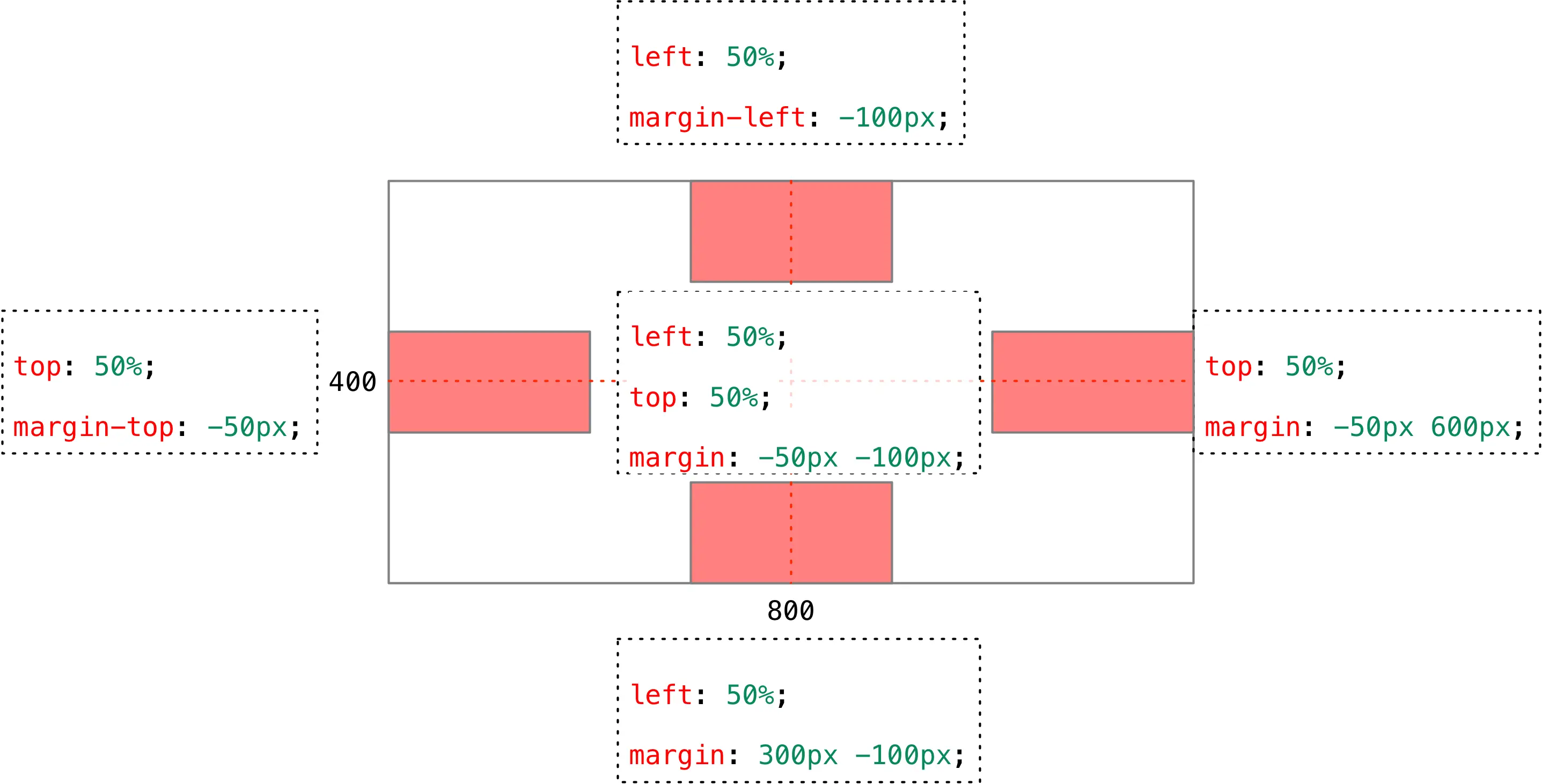 left: 50%;:让盒子的左侧移动到父级元素的水平中心位置;margin-left: -100px;:让盒子向左移动自身宽度的一半。