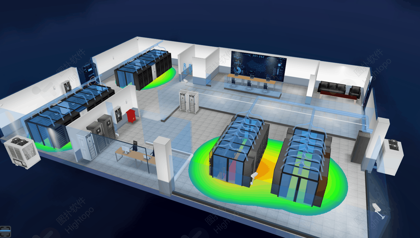 从数据中心智慧化的运维发展趋势看,自动检测方法将会成为未来热点检测的方向。而数据可视化系统可以通过模型还原场景,面板承载数据的监控,底层则通过自动检测所采集的温度数据,反馈给可视化系统的温度云图来呈现出当前机房的热点分布,HT 的轻量模型建模是一种很好的解决方案,适用于机房检测温度呈现的可视化系统的搭建。
