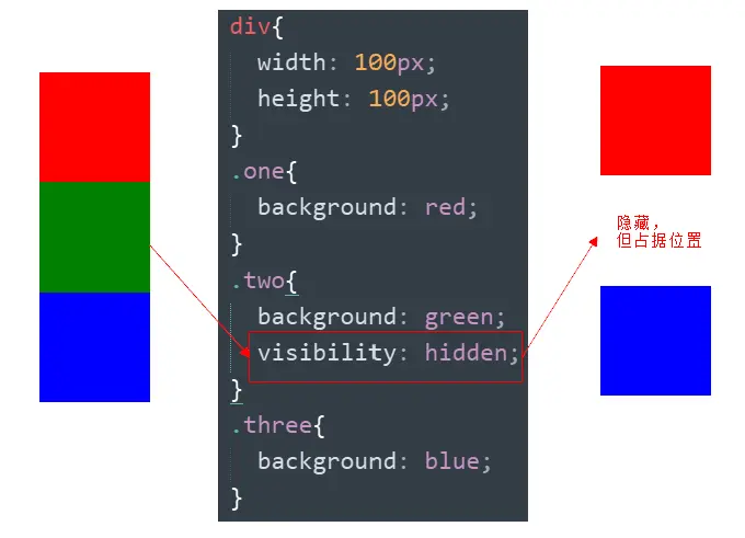 | visibility 可见性 (了解) | 隐藏对象,保留位置 | 使用较少 |
