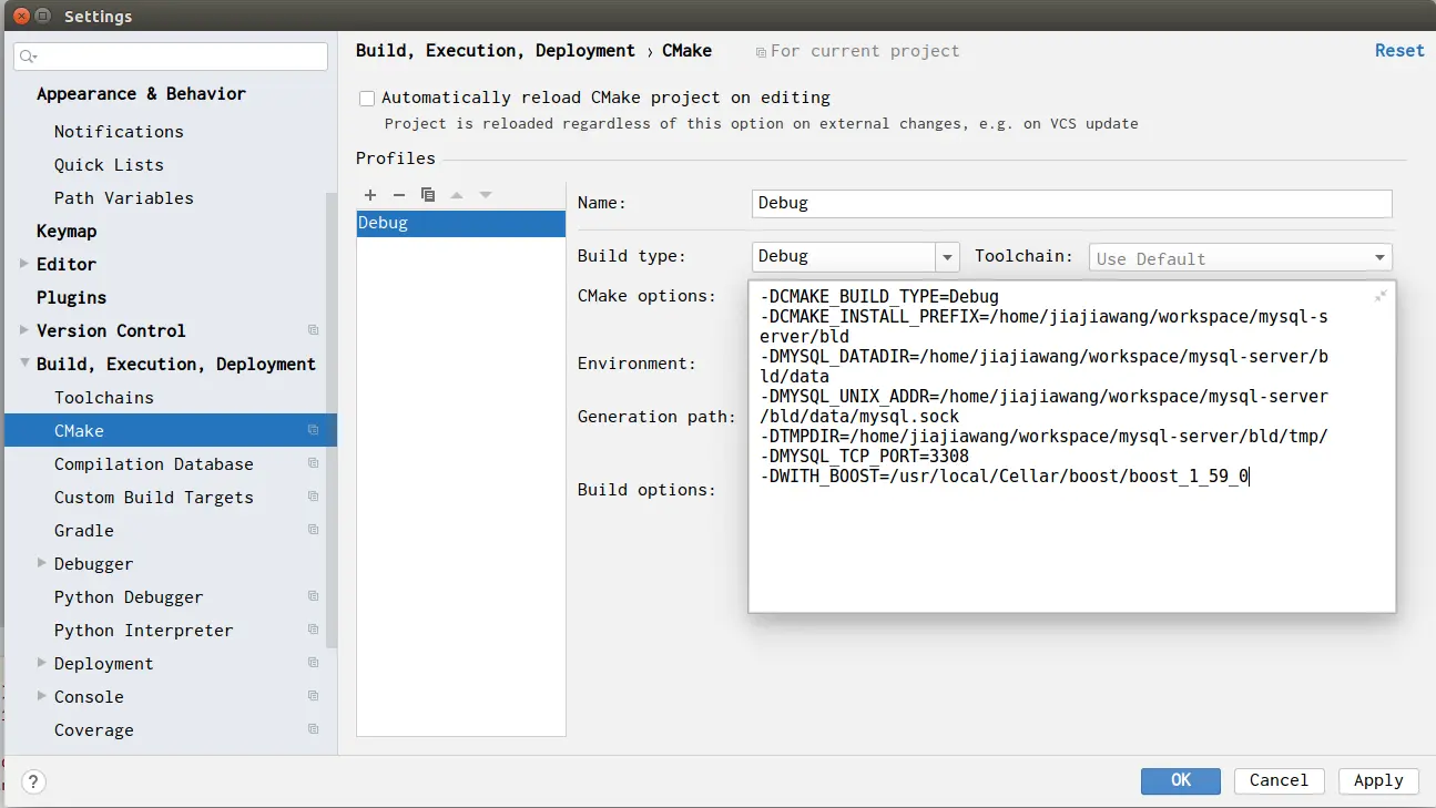 cmake -DCMAKE_BUILD_TYPE=Debug -DCMAKE_INSTALL_PREFIX=/home/jiajiawang/workspace/mysql-server/bld -DMYSQL_DATADIR=/home/jiajiawang/workspace/mysql-server/bld/data -DMYSQL_UNIX_ADDR=/home/jiajiawang/workspace/mysql-server/bld/data/mysql.sock -DTMPDIR=/home/jiajiawang/workspace/mysql-server/bld/tmp/ -DMYSQL_TCP_PORT=3336 -DWITH_BOOST=/home/jiajiawang/software/boost_1_59_0