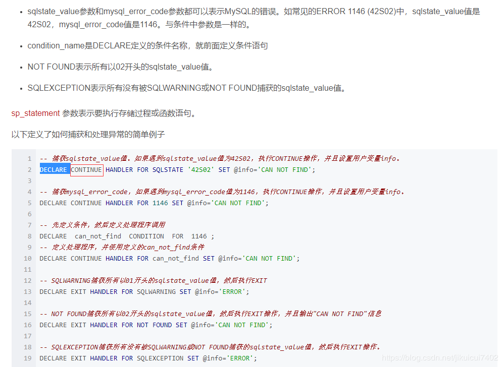 定义条件和处理程序是事先定义程序执行过程中可能遇到的问题,并且可以在处理程序中定义解决这些问题的办法,可以简单理解为异常处理,这种方式可以提前预测可能出现的问题,并提出解决办法,从而增强程序健壮性,避免程序异常停止。MySQL通过DECLARE关键字来定义条件和处理程序。