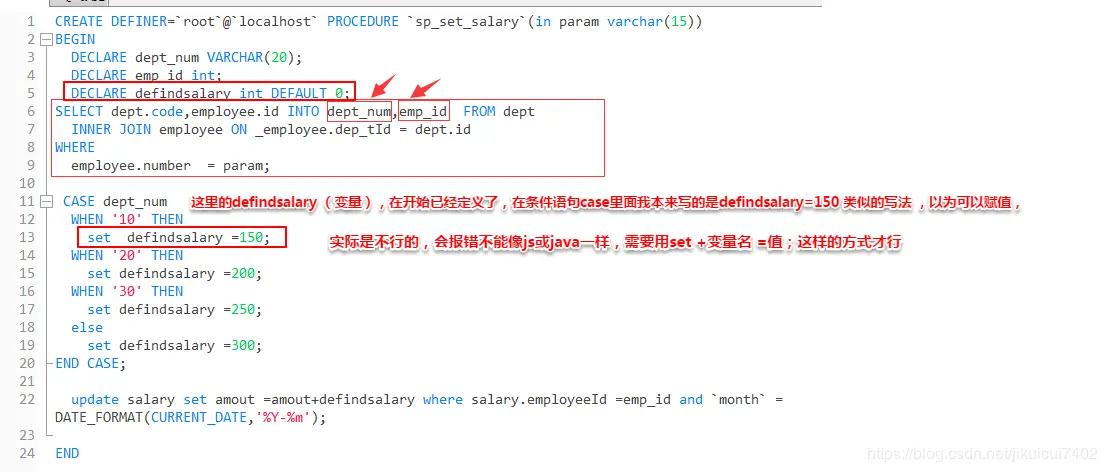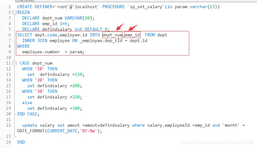 如上图就是给多个变量设置值,像单个变量的查询结果设置值是这样的 select aa into @变量1 from 表 ,我们会理所当然认为多个参数是 select aa into @变量1,bb into @变量2 from 表,实际是错 的,会导致sql报错,需要如图所示的写法参数的位置和前面的参数列一一对应。另外需要注意的是结果集不能大于1.否则程序也会报错。