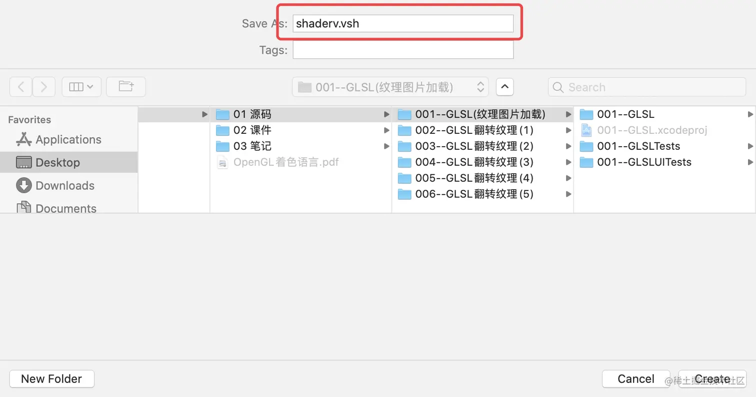 将文件重命名为.vsh后缀的文件,此文件的.vsh后缀名不是给xcode标记为什么文件,而是告诉开发者,此文件是顶点着色器文件。