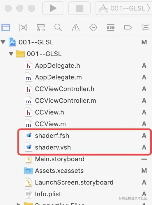 第一步:创建Xcode工程,并创建shaderv.vsh和shaderf.fsh文件