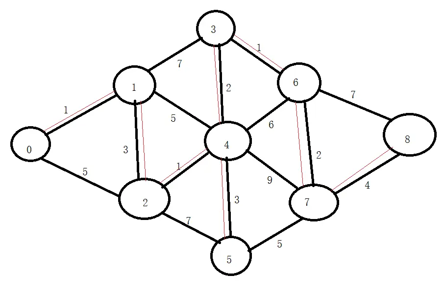 prim算法 从0节点开始,每次都选择代价最小的那一条路,直到结束。