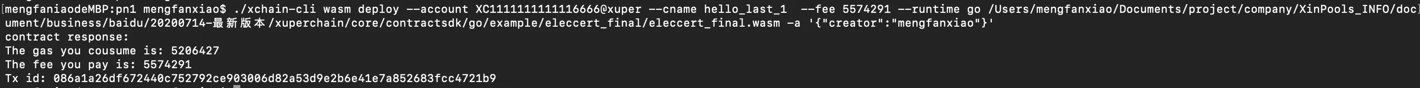 ./xchain-cli wasm deploy --account XC1111111111116666@xuper --cname hello_last_1 --fee 5574291 --runtime go /Users/mengfanxiao/Documents/project/company/XinPools_INFO/document/business/baidu/20200714-最新版本/xuperchain/core/contractsdk/go/example/eleccert_final/eleccert_final.wasm -a '{"creator":"mengfanxiao"}'