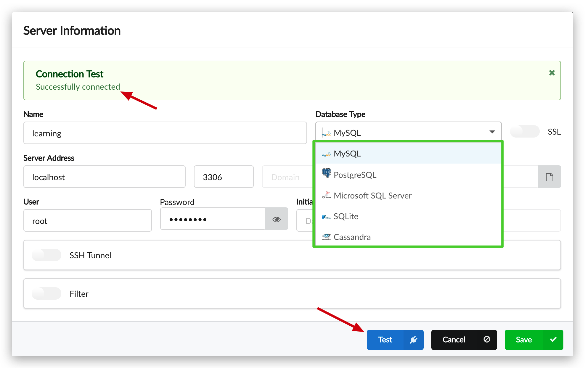 填写相关信息,从Database Type 中你应该已经看到了,目前支持的数据库类型有: