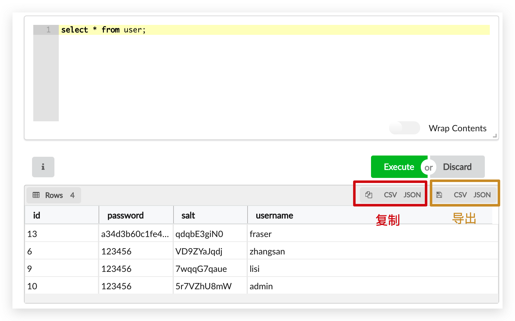 获取执行结果后,可以快速粘贴为 JSON 或 CSV 格式,当然也可以导出相应格式文件,非常方便