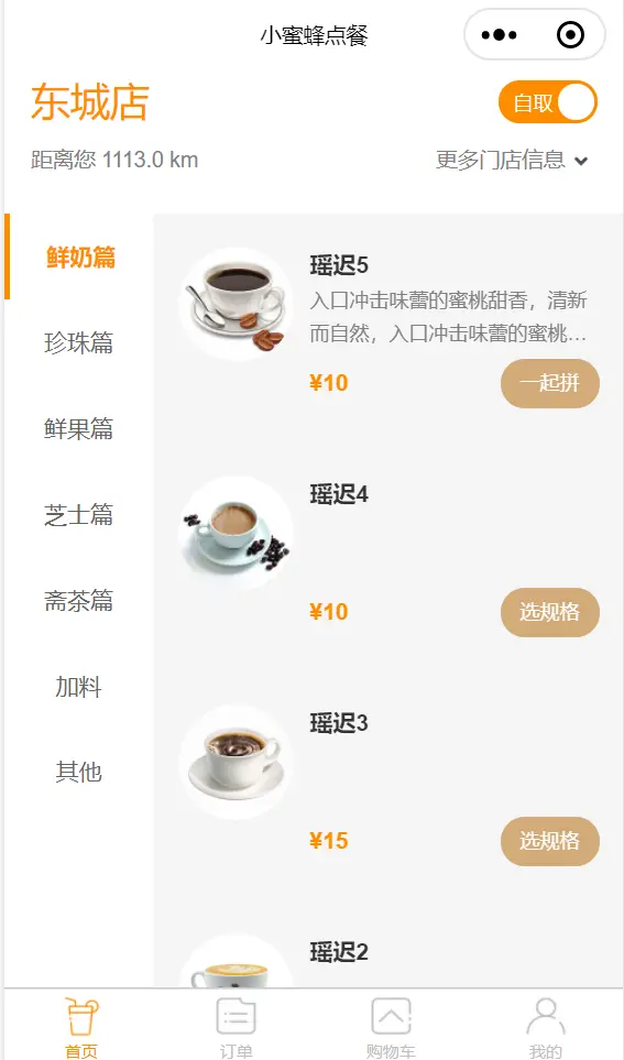 | 首页 | 定位功能及门店信息 | 下单 | 拼单 |