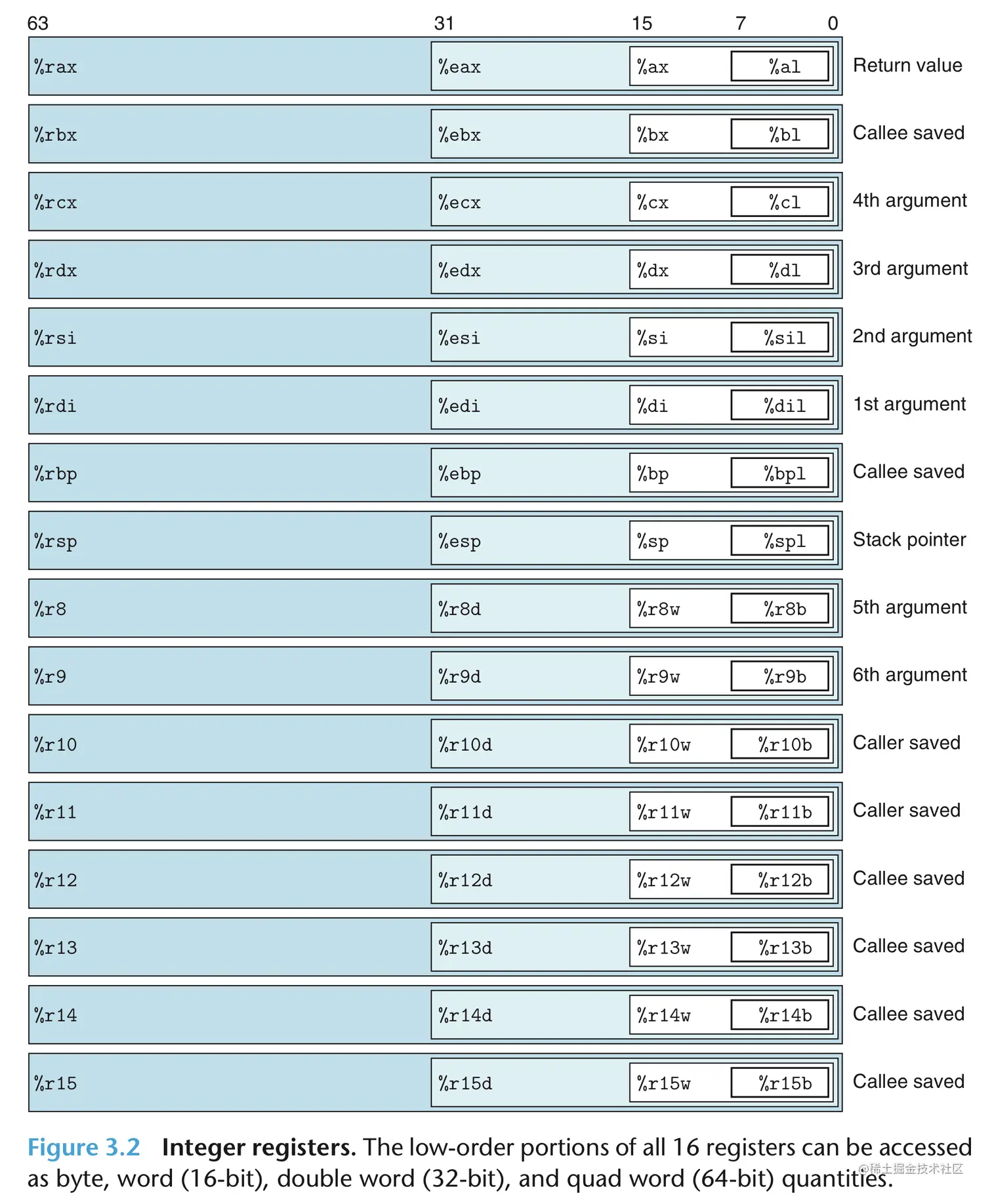 整数寄存器文件包含了16个命名的位置(就是寄存器可见的意思),分别存储64位的值。寄存器可以用来存储地址(就像C语言的指针),或者保存程序状态,再或者某些寄存器用于保存临时数据,列如过程调用的参数和局部变量,以及函数返回值。