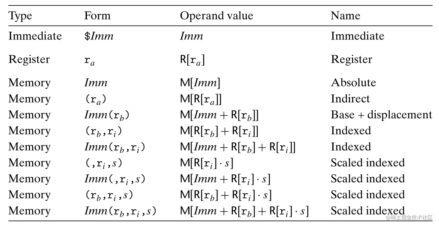 在这张表里,只有前两个得到的是直接的值,其余都要翻译成内存地址来进行寻址操作然后取值。