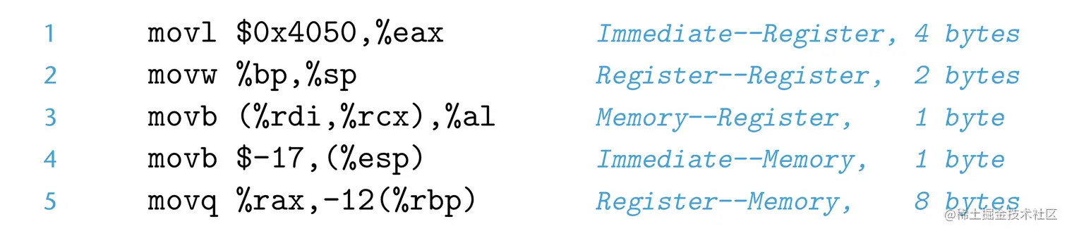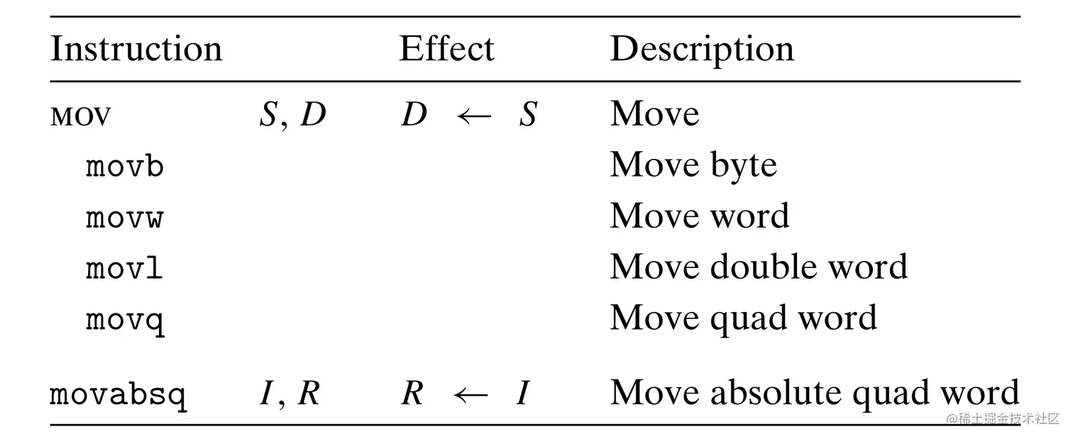 一般而言,指令后面都会跟着一个后缀,表明操作数的大小。浮点数和整数使用的是完全不同的指令和寄存器。