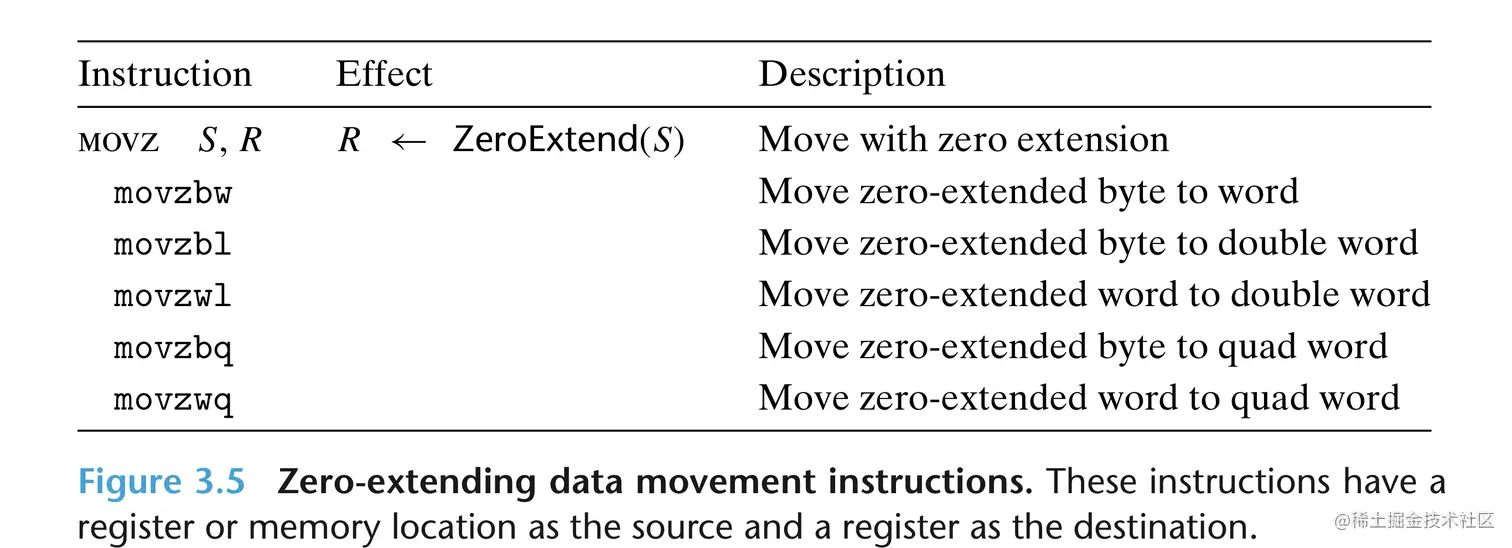 有两类指令,适用于把较小(位长)的源数据复制到较大(位长)的目的地时使用,MOVZ使用0扩展位长;MOVS使用符号扩展位长,就是复制源数据的最高有效位。然后它们的后两个都是位长,第一个指定了源数据的大小,第二个指定了目的的大小。