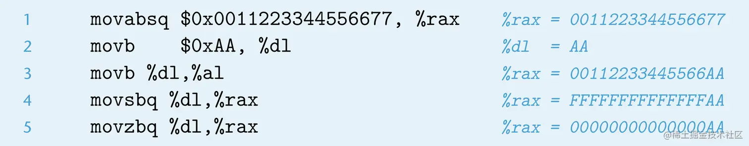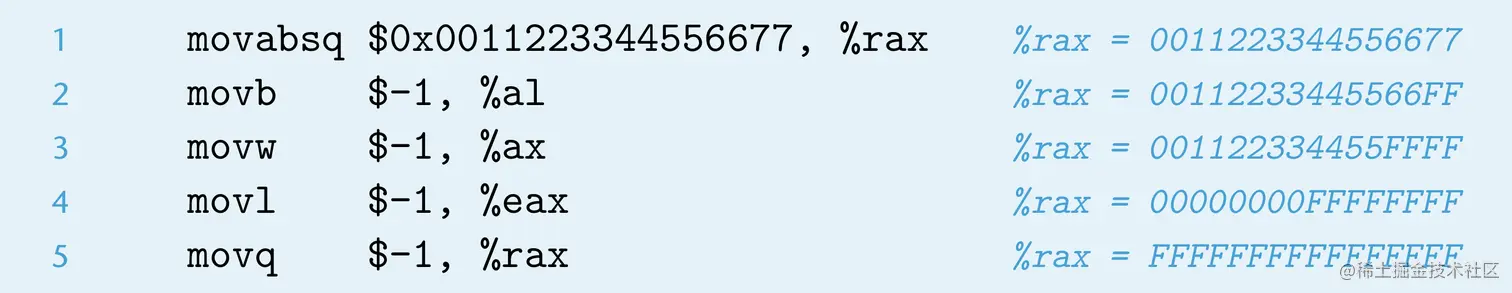x86-64对于MOV指令加了一个限制,就是不能直接把一个值从内存的某个位置复制到另一个位置,而必须使用寄存器作为中介。MOV指令的后缀表明了操作数据的大小,也就是寄存器的大小,不管这个寄存器是源数据还是目的地址,都必须符合指令指定的大小。MOV指令只会更新目的操作数指定的寄存器字节或内存位置(就是只更新指定的低位字节),高位字节有其他的设置,但是有一个例外,就是movl指令,当它把寄存器作为目的地址时,会把高32位设为0。