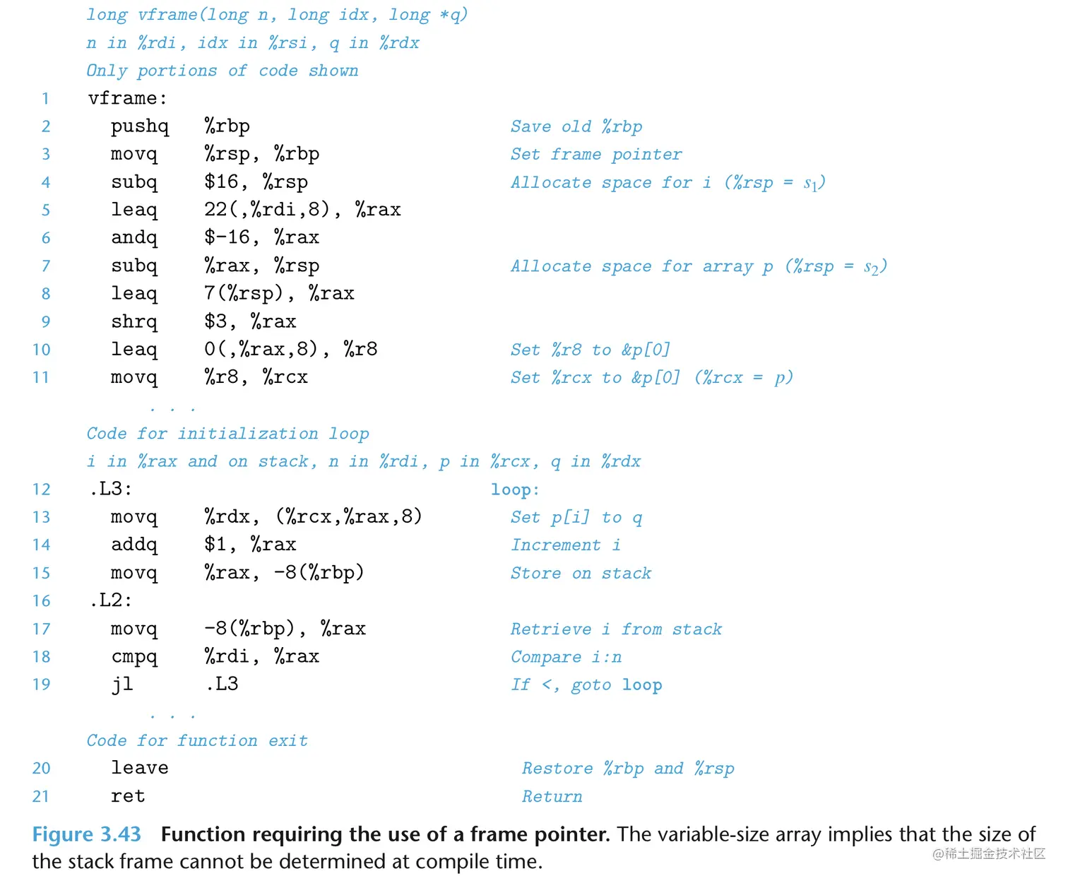程序必须把%rbp的值保存在栈中,因为它是一个被调用者保存寄存器。然后把%rbp指向此时的位置(此时还未为数组等可变数据分配空间),然后它就不动了,至于引用局部变量,保存的寄存器等栈里面的数据,就用它们相对于%rbp的偏移量来实现。