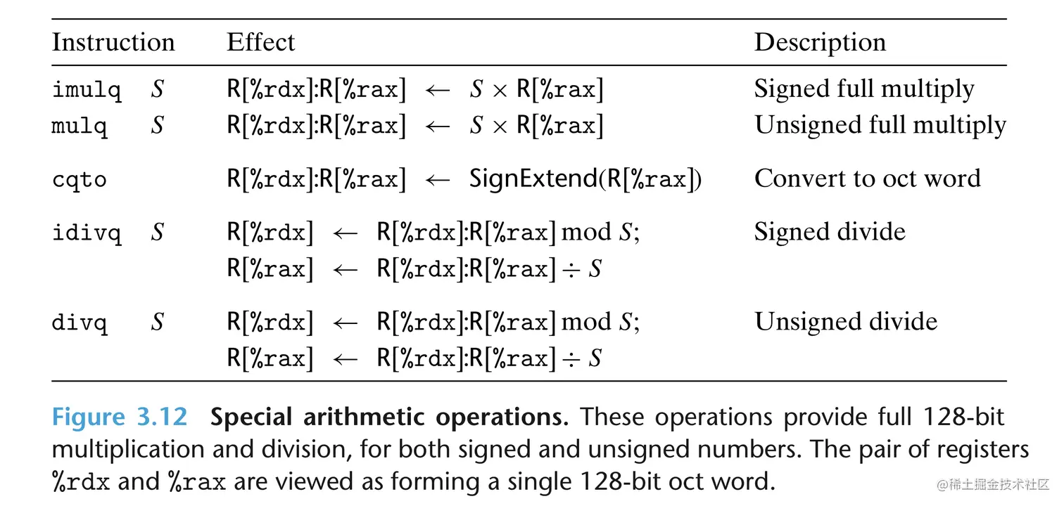 在此解释一下,imulq是处理有符号数的乘法指令,mulq是处理无符号数的,它们都把128位结果的高64位存在%rdx里,把低64位结果存在%rax里;至于操作数,那是乘以的参数,另一个参数存放在%rax中