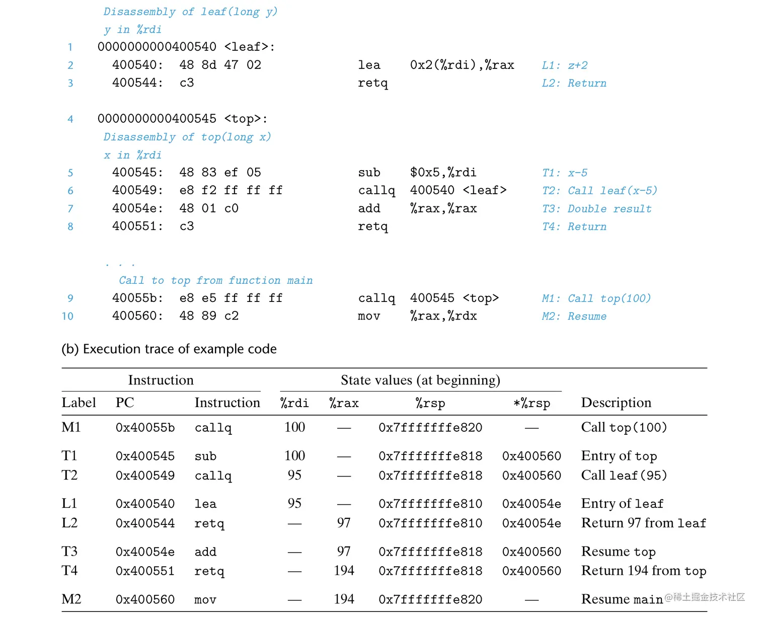 为了防止P的寄存器被Q过程覆盖,x86-64规定了一组规则,把寄存器做了分类。根据惯例,寄存器%rbx, %rbp, %r12~%r15被划分成被调用者保存寄存器;而除了这几个寄存器,以及栈指针%rsp之外的寄存器,都是调用者保存寄存器。什么意思呢?假如P调用了Q,那么被调用者保存寄存器要求Q对这几个寄存器进行保存,以便在返回到P时,这几个寄存器的值不变。后者要求P提前保存好相关的寄存器,因为Q可能会产生修改。