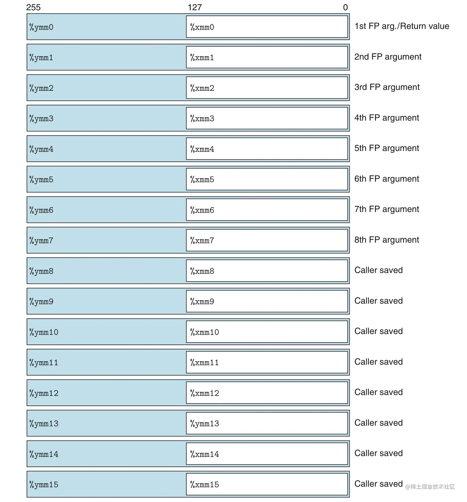 - XMM寄存器%xmm0~%xmm7,最多可以传递8个浮点数。按照参数列出的顺序使用这些寄存器,可以通过栈传递额外的浮点参数。