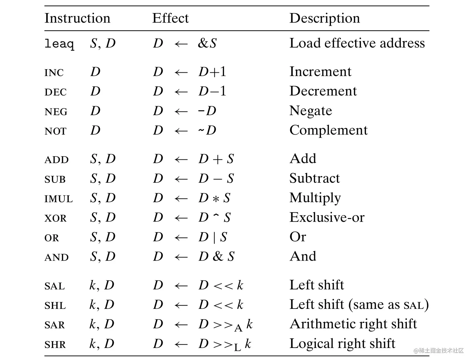 来看一些常见的整数以及逻辑操作。它们被分成了四大类,分别是:加载有效地址,一元操作,二元操作和移位。