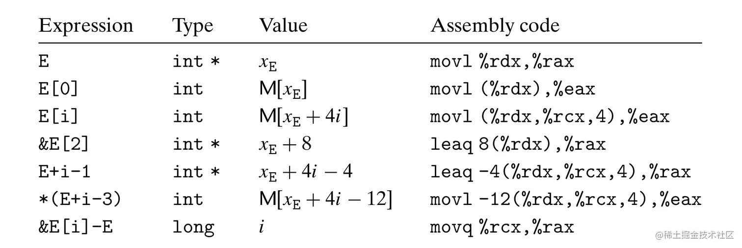 对于C语言的聚合类型,比如数组和结构体,在机器代码中就是一组连续的字节表示。同时对于汇编代码来说,它不区分有符号数和无符号数,各种指针类型,甚至不区分整数和指针(因为指针就是整数类型,只是C强调了指针类型这个概念,指针的值就是无符号数)。