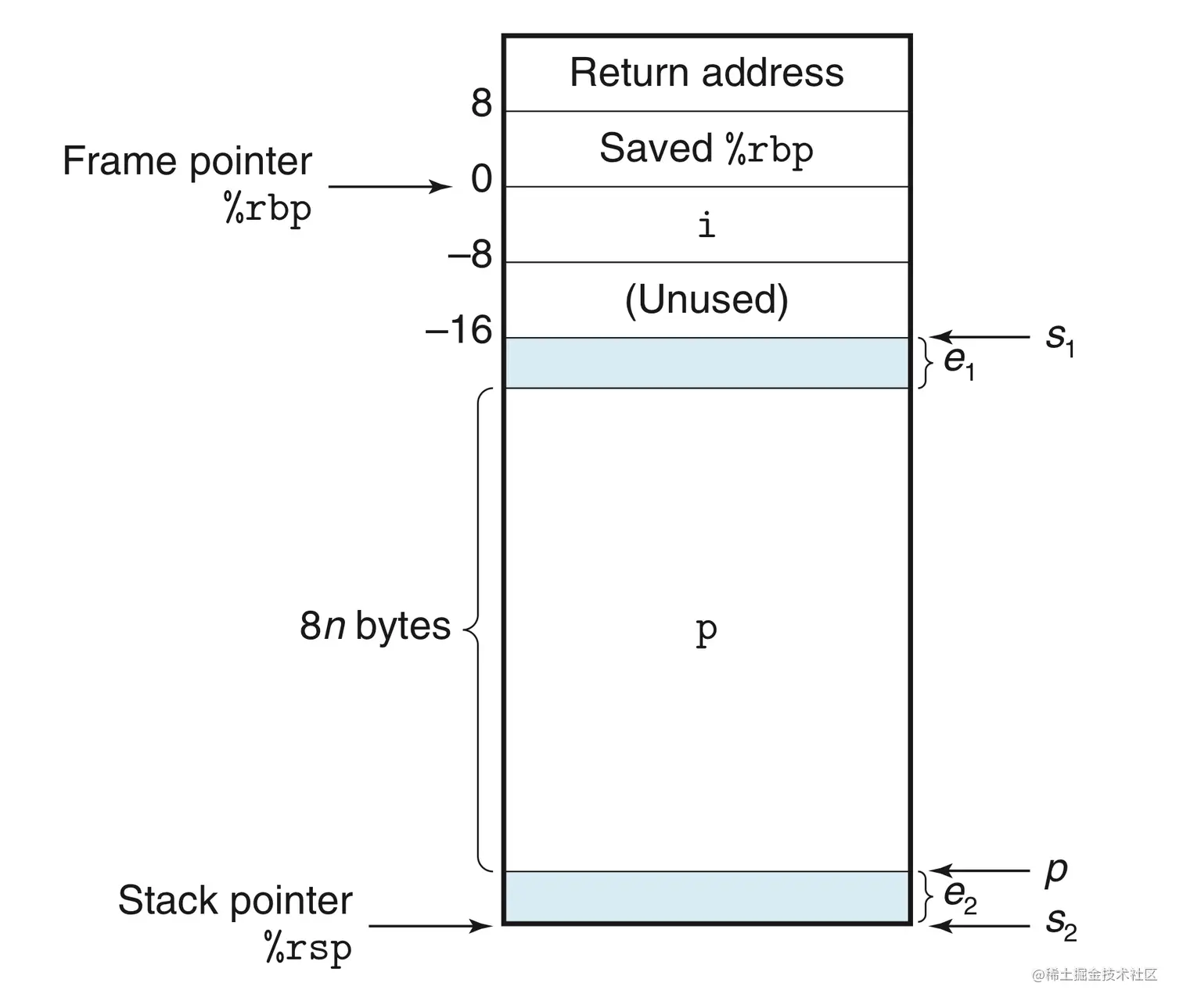 数组元素类型的长度是8字节。注释上有的我就不解释了,那个没啥好说的。现在来看看这个5,6行,第5行不难理解,%rax的值为n*8+22,为什么是+22呢?看后面;第6行把%rax=%rax^(-16),而-16的二进制是1...10000,这个的结果是把rax变成了一个8的倍数,且最少比数组实际需要的空间大8。第7行分配空间没什么好说的。第8行的意思是%rax=%rsp+7,为什么减少了7个呢?为了节省空间,因为刚刚分配多了。第9行逻辑右移3位,相当于除以8并向下取整得到%rax,猜猜看这是什么意思?再看第10行,数组首地址等于%rax*8,哦!第9行在对齐呢!这时就可以说得清了,多出来的和是用来补全对齐后的数组的空间。只是这次的对齐是前后都有补全。