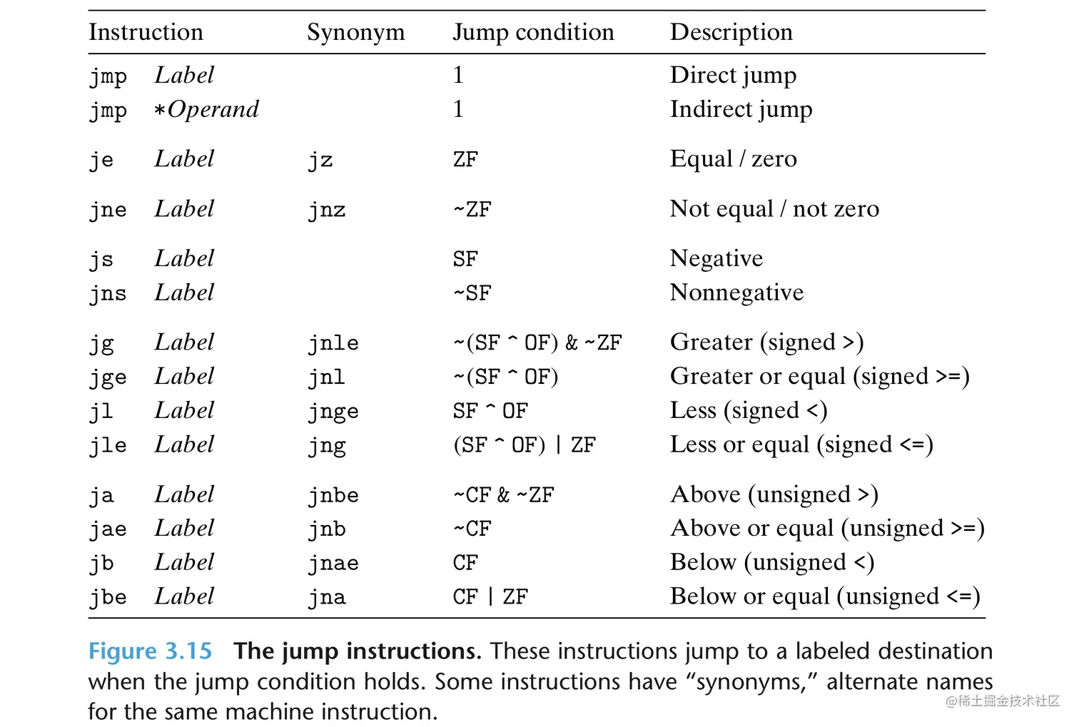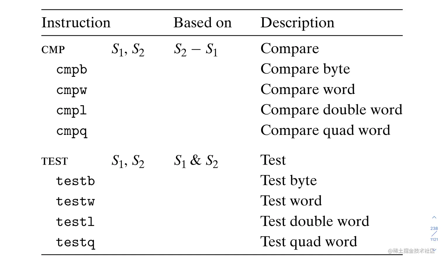 而有些指令只设置条件码而不改变寄存器,比如如下所示的CMP家族和TEST家族,它们仅仅根据两个操作数之差来设置条件码。除了只设置条件码而不进行目的寄存器的更新外,CMP和SUB指令是一样的。TEST指令的行为和AND指令一样,除了它们不会更改目的寄存器的值外。