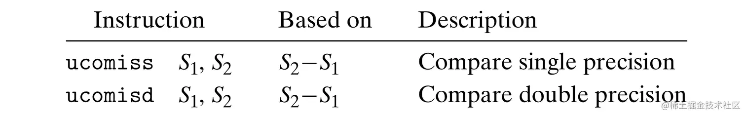 当操作数出现NaN时,会出现无序的现象,可以通过奇偶标志位发现这种情况。jp指令是条件跳转,跳转条件就是运算发生了无序的结果。除此之外,进位和零标志位都和对应的无符号数比较一样。