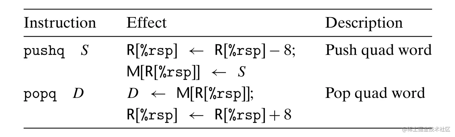 pushq指令的功能是把数据压入栈中,而popq是弹出指令。不过它们都涉及两个操作,pushq是首先在栈底指针%rsp里存着新的值得地址,然后设置内存中的这个位置得值为准备压入得数据。所以它的操作数是数据源,而popq则是首先把栈顶的值复制到操作数里,然后指针回退,也就是+8(栈顶指针+8意味着减小8字节的空间,因为它是向下增长,+的话就代表往上回去了)。注意哈!这操作的都是8字节下,64位。