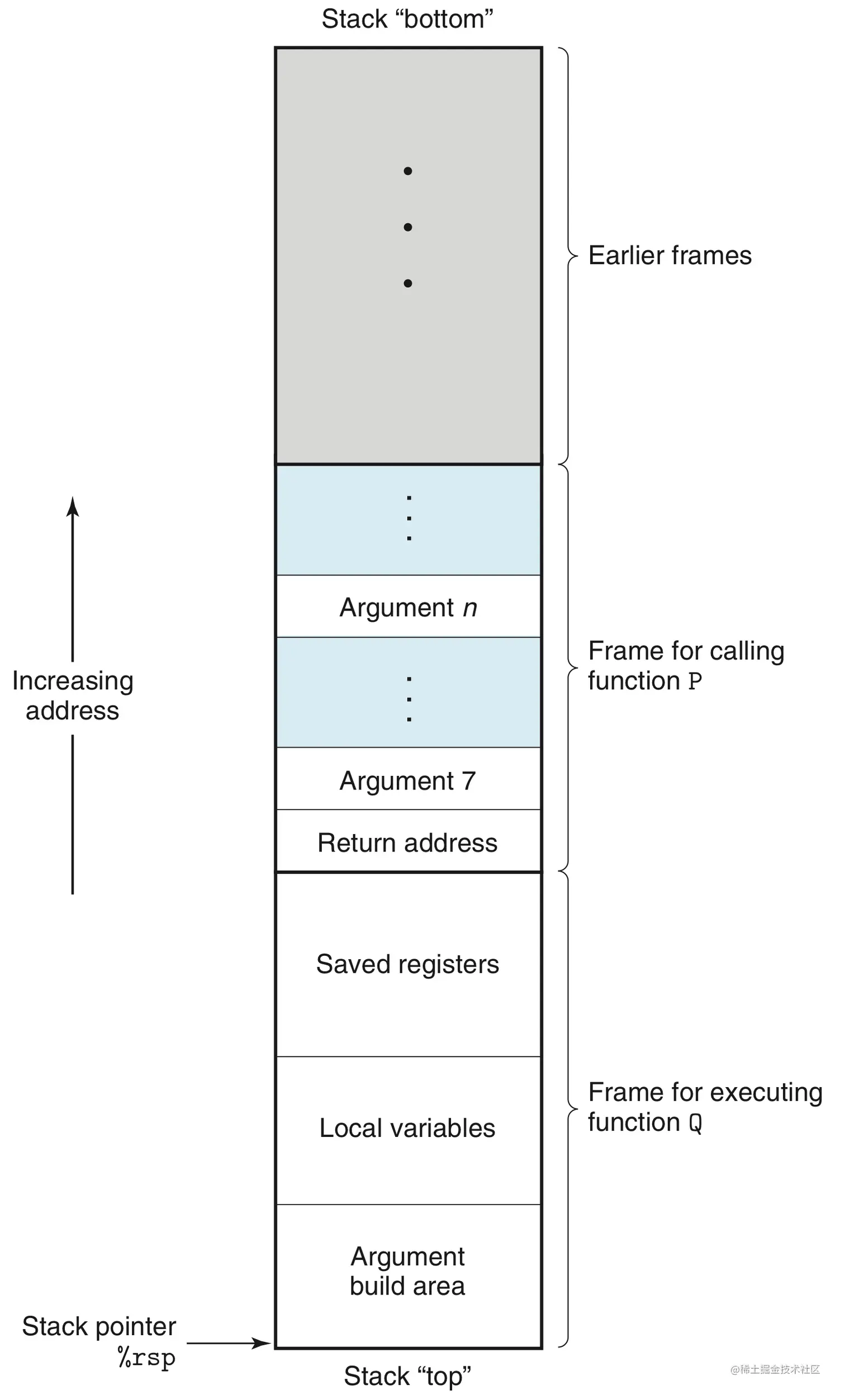 一般来说,过程通过减小栈指针来实现空间的分配,分配的结果作为栈帧的一部分。