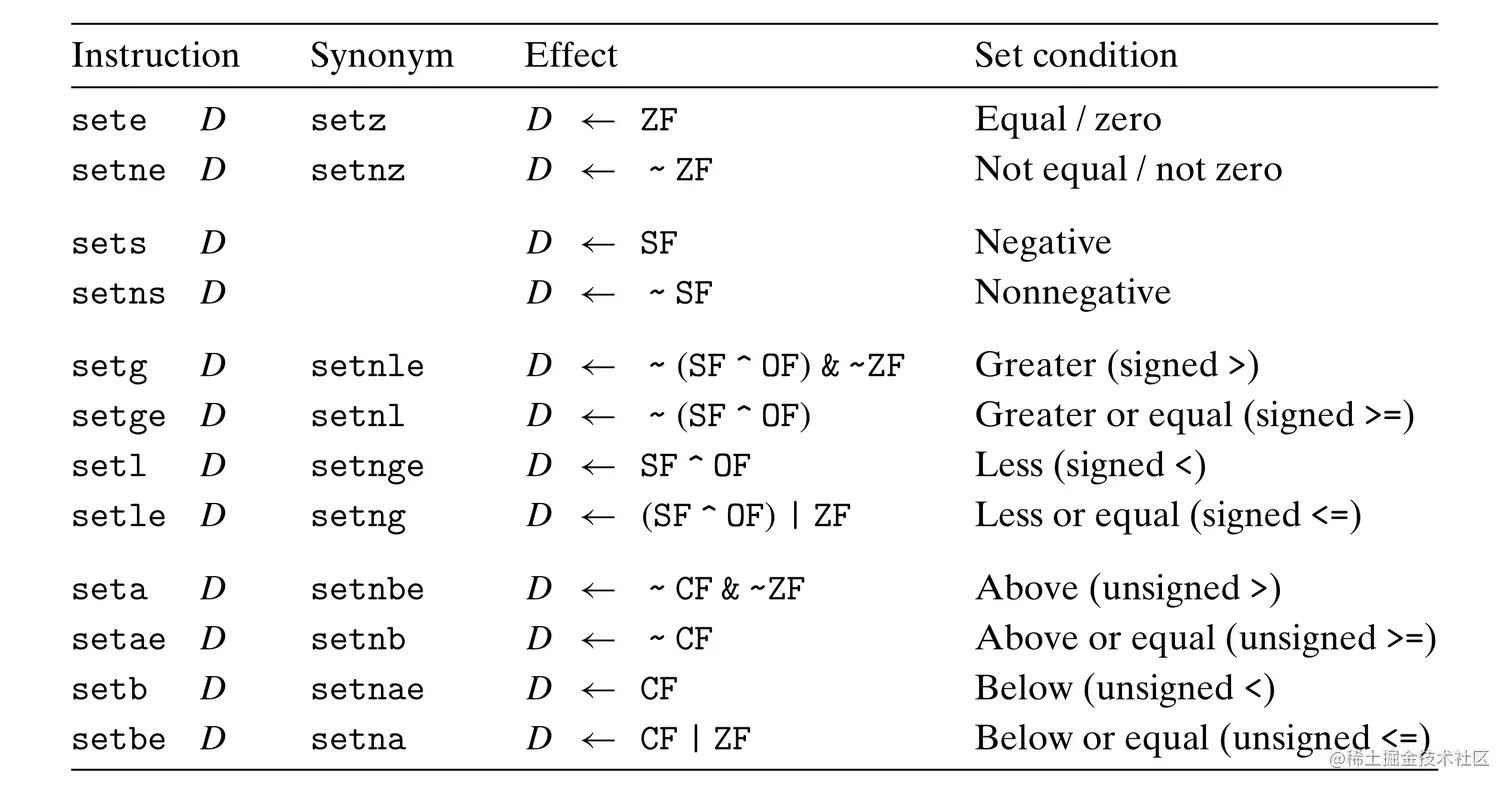 一般而言,SET指令存在于那些可以更改条件码的指令的后面,这样就可以读取到最新的值了,当然也可以不这么做。至于每个指令把目的操作数到底设置成了什么?可以通过条件码计算,也可以通过a-b(如果前面是CMP b,a指令(AT&T格式))或a+b(如果前面是TEST b,a指令(AT&T格式))的计算结果来判断。